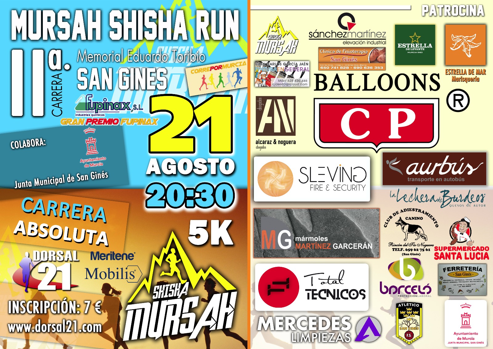 El martes 21 de Agosto de 2018 se va a disputar las II Mursah Shisha Run San Ginés “Memorial Eduardo Toribio” cuya salida se dará a las 20:30 horas para iniciar un recorrido totalmente urbano sobre una distancia aproximada de 5.000 metros aprox. (1 vuelta a un circuito totalmente urbano)