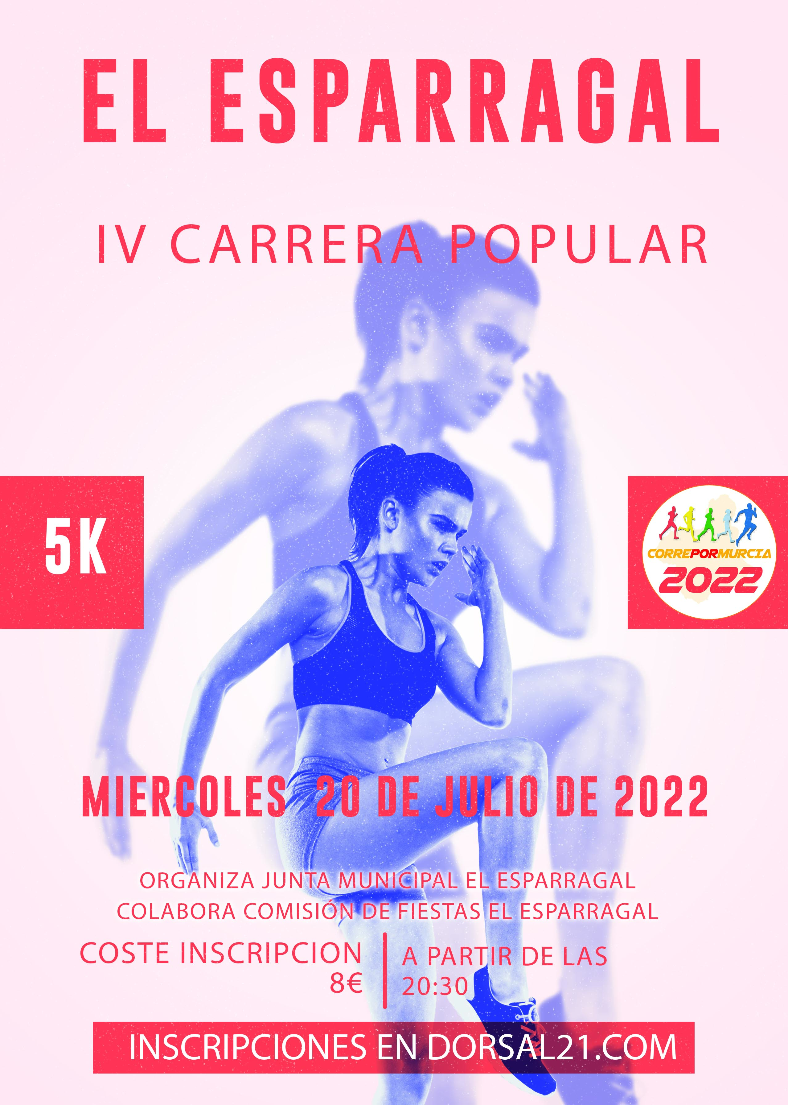 La Junta Municipal del Esparragal en colaboración con la Comisión de Fiestas organizan el día 20 de julio de 2022 la “IV Carrera El Esparragal” en la modalidad de carrera popular 5,5k, estableciéndose el siguiente reglamento y que debe ser aceptado por los participantes.